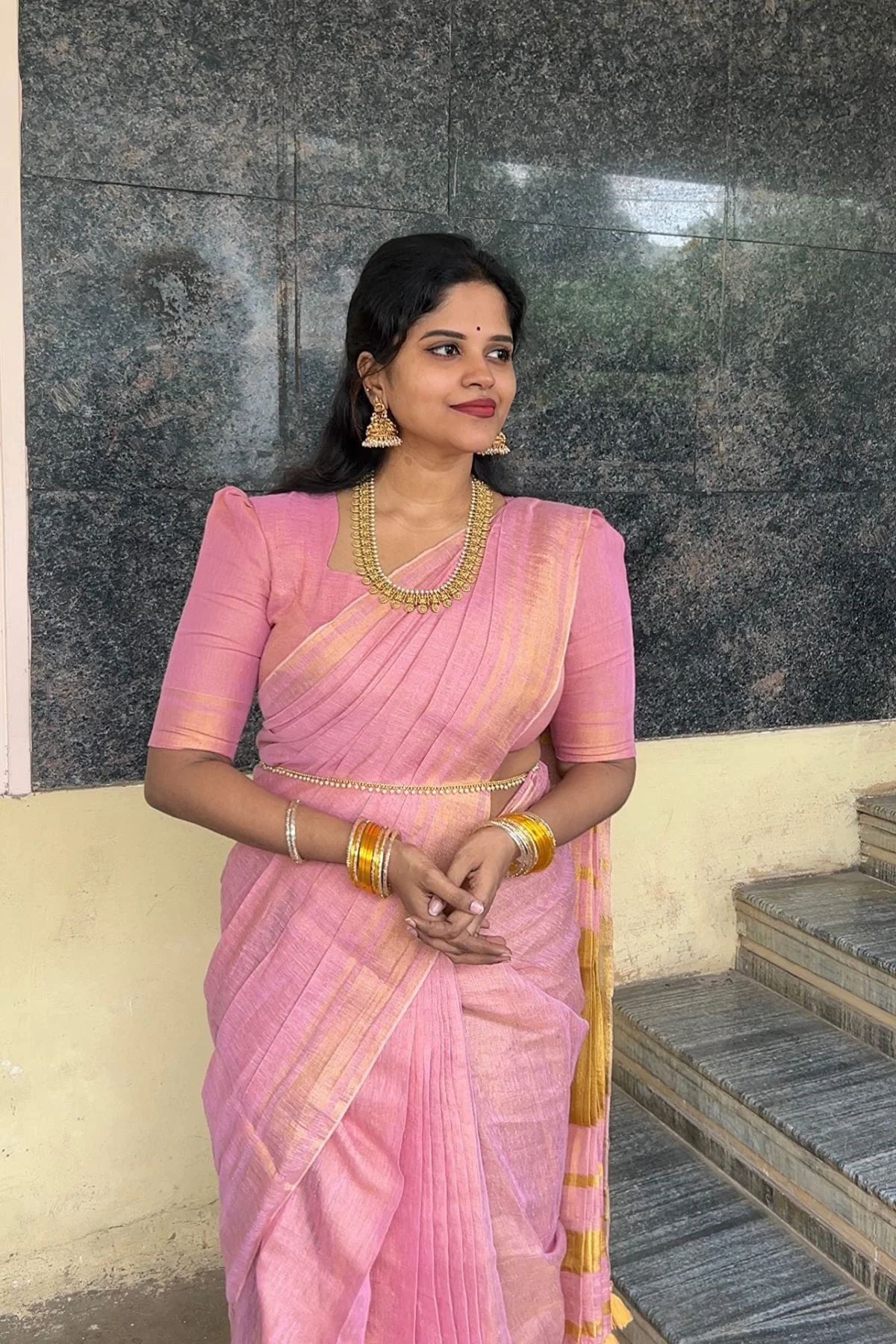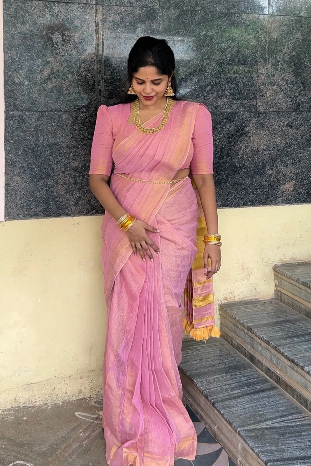This stunning handloom linen zari tissue saree is here to steal hearts! The soft shimmer in this shade adds a beautiful glow, making it look effortlessly elegant and festive. And yes, tassels makes it even more beautiful right! A must-have for your special days!