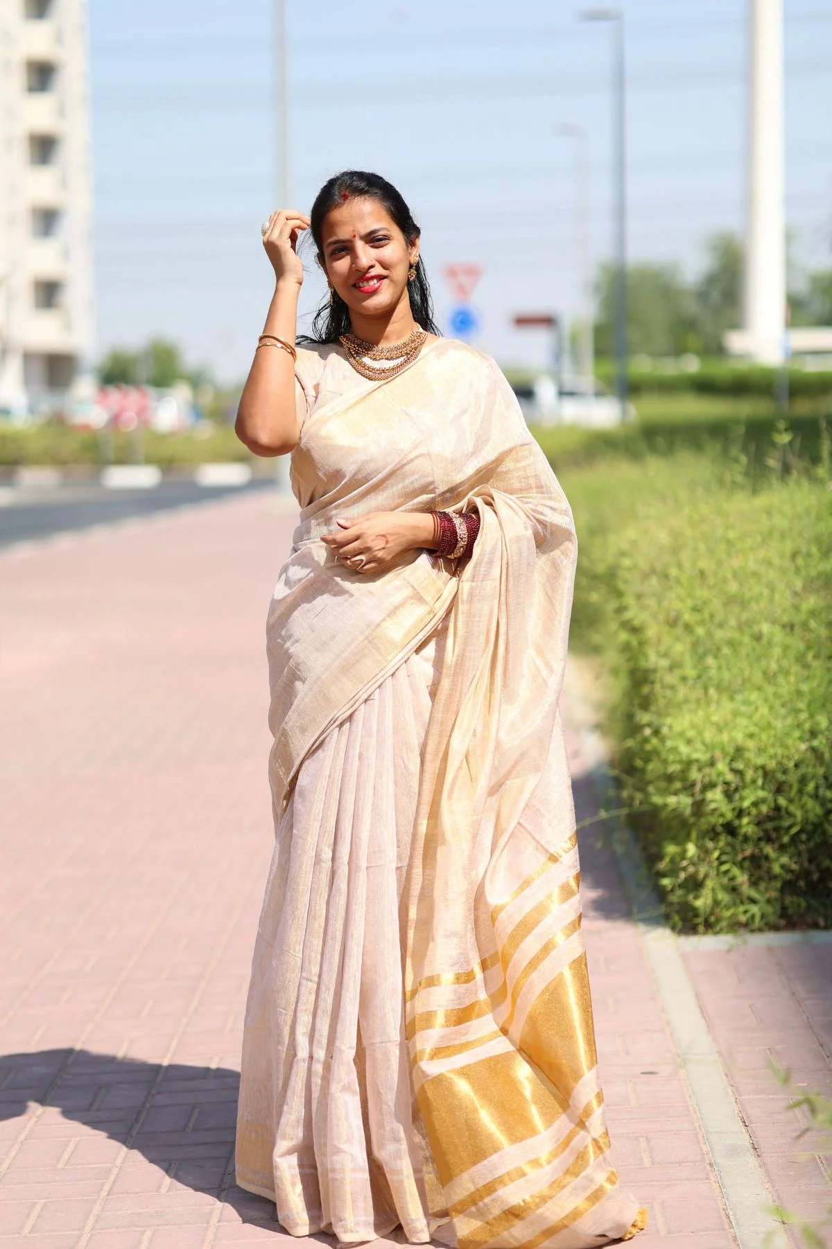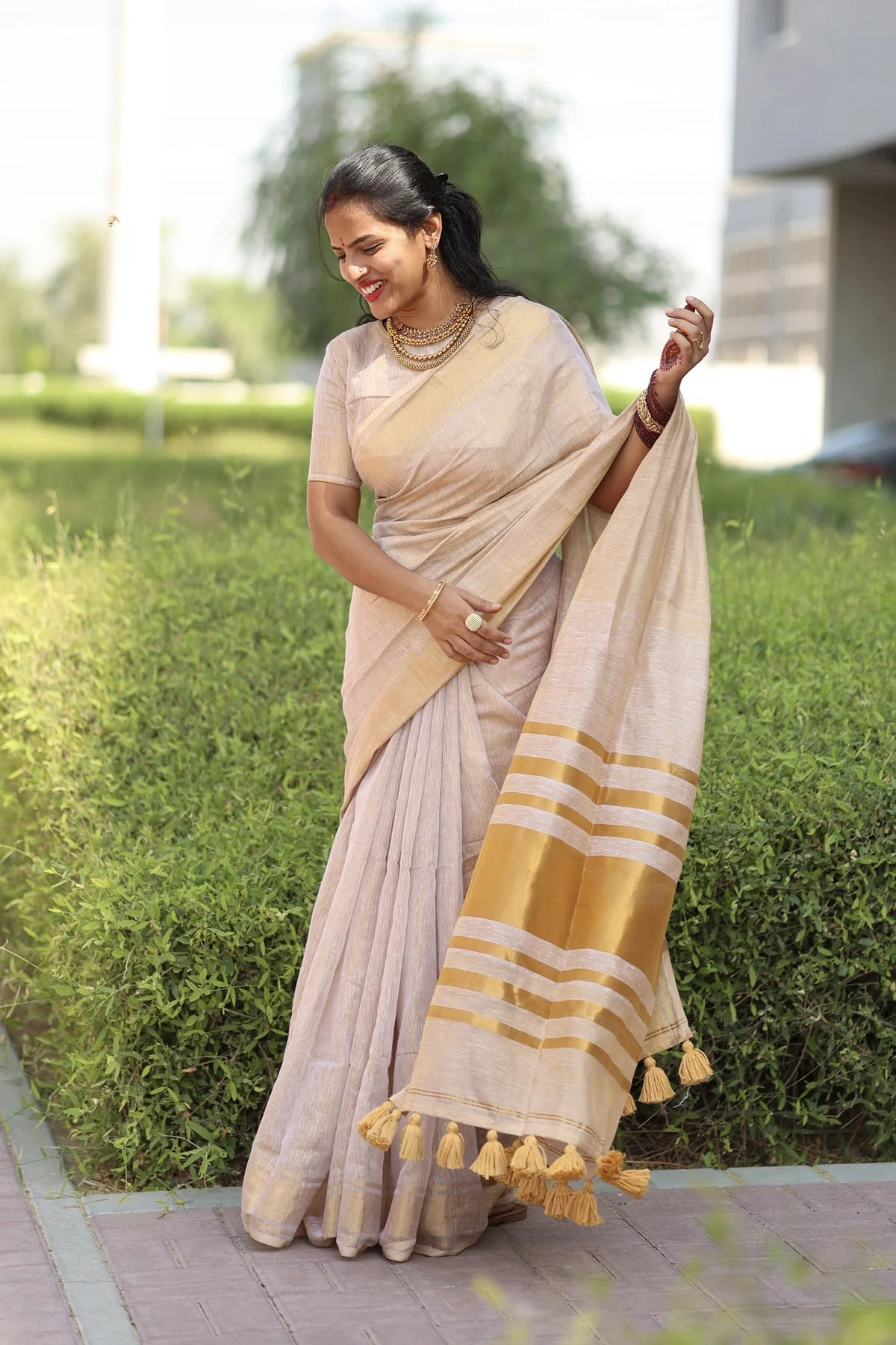 This stunning linen zari tissue saree is here to steal hearts! The soft shimmer in this shade adds a beautiful glow, making it look effortlessly elegant and festive. And yes, tassels makes it even more beautiful right! A must-have for your special days!
