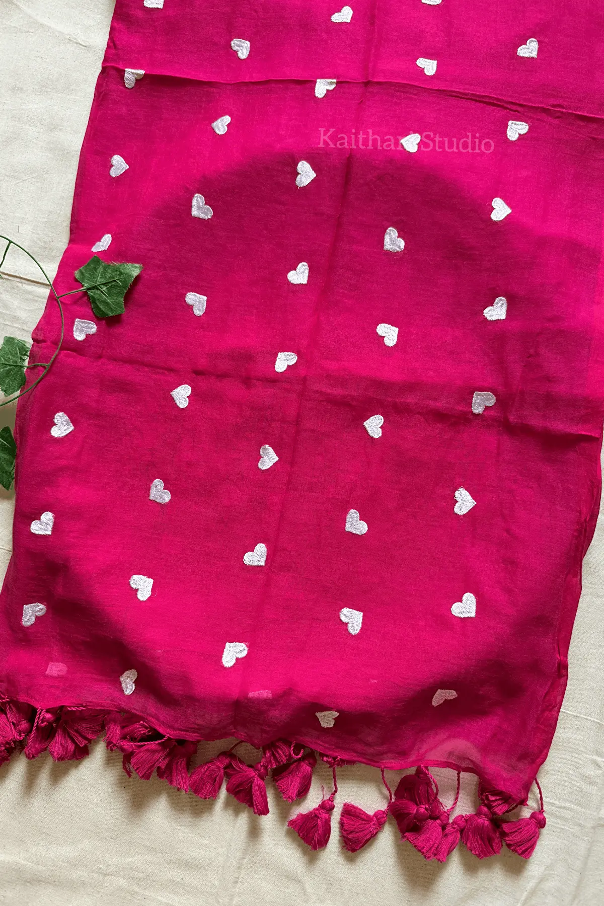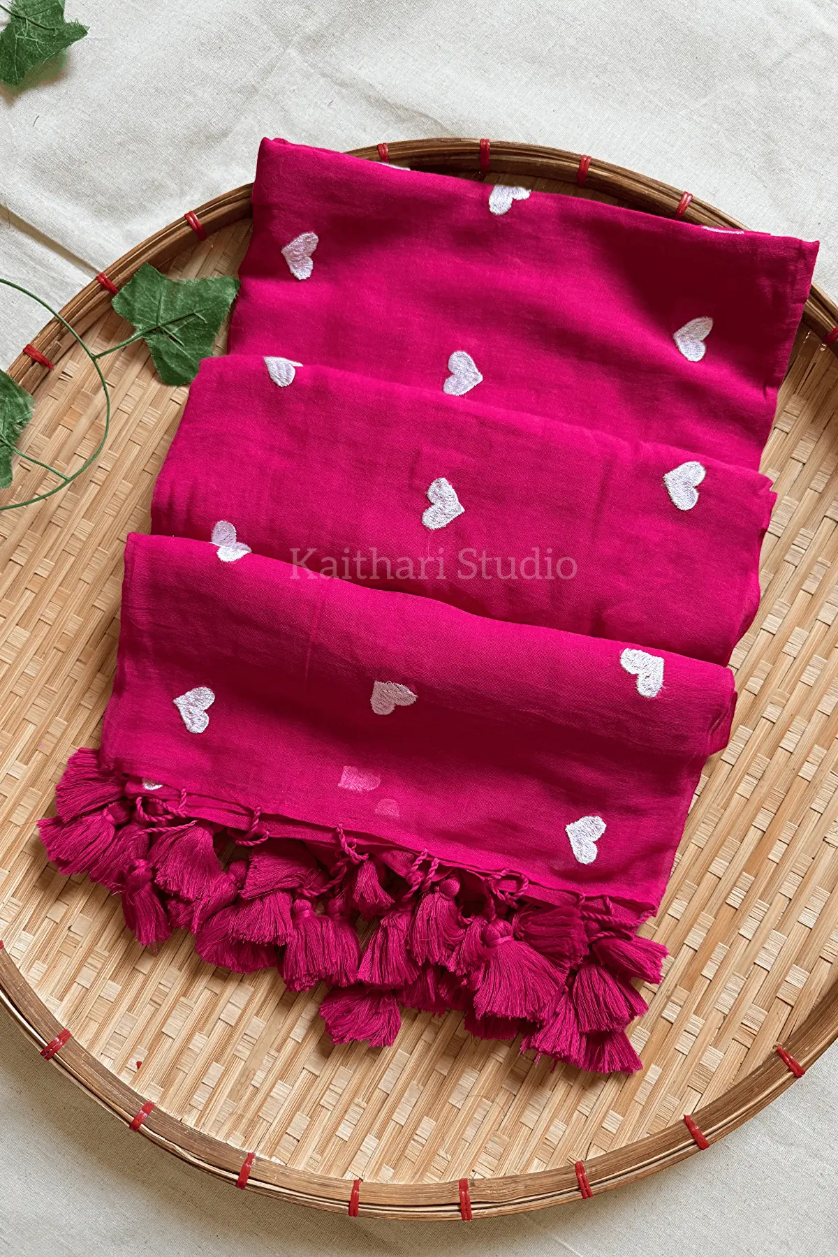 Heart Embroidery Mul Cotton Sarees – Dark Pink- KS043