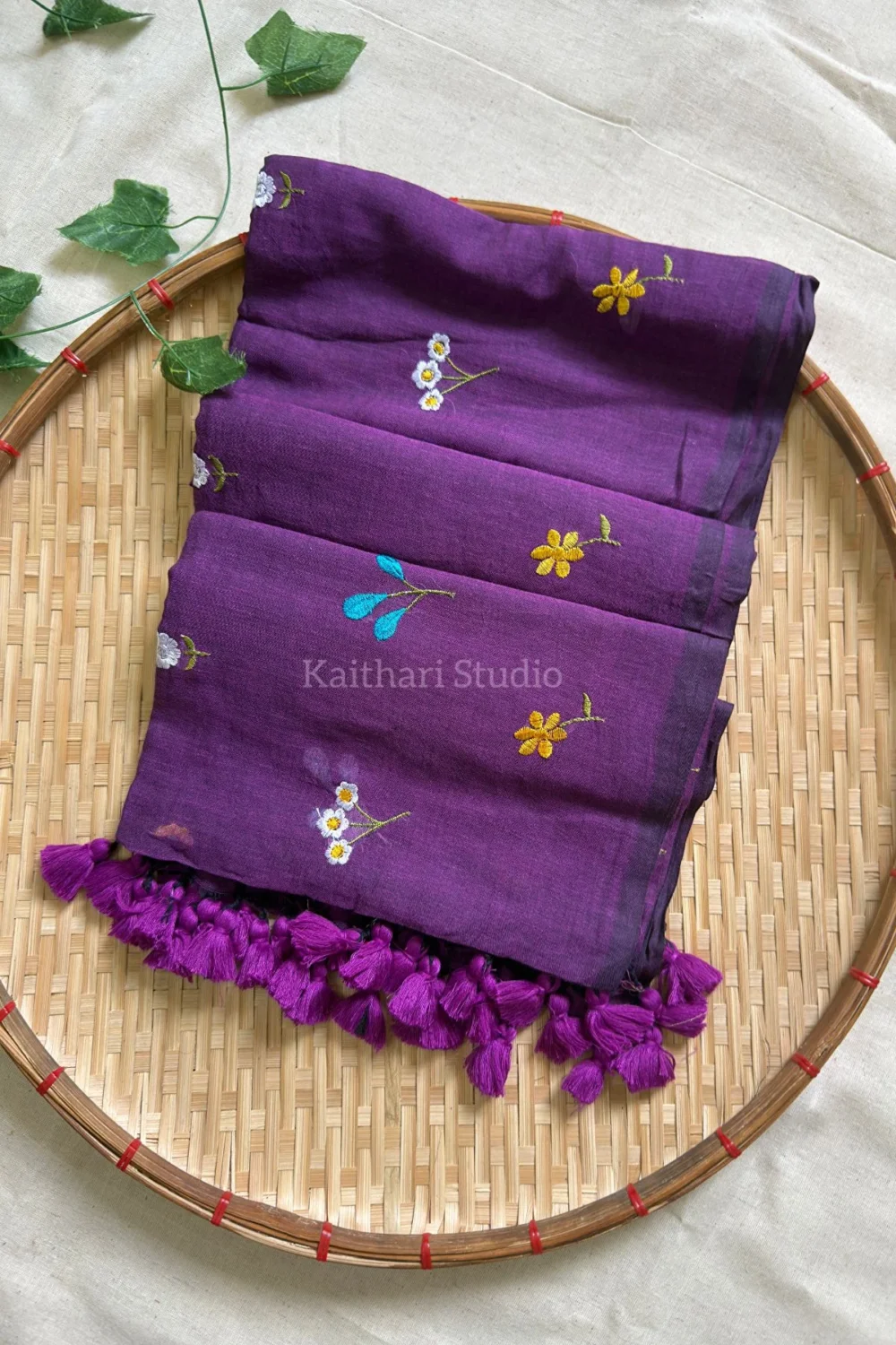 These are handcrafted in pure mul cotton (120 count) material, featuring delicate flower embroidery all over the saree. So soft and flowy, they effortlessly pass through a finger ring. Perfectly easy to drape and carry—your new go-to for timeless grace